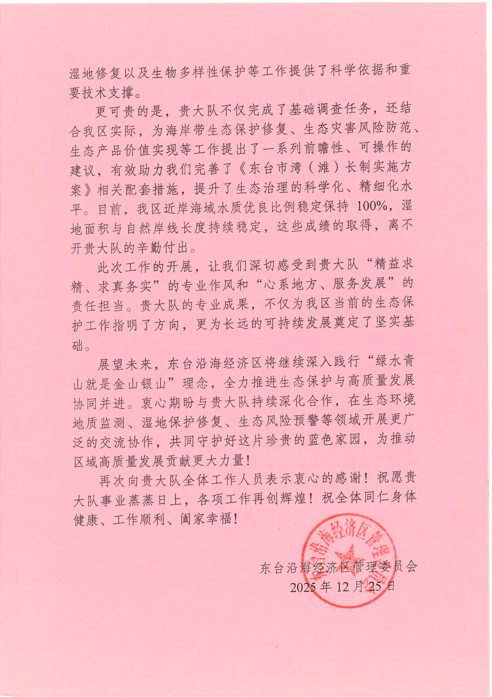 近日,江苏省生态地质调查大队陆续收到中国地质调查局南京地质调查中心、泰州市苏陈镇人民政府、扬州市高邮生态环境局等多家单位发来的感谢信。信中围绕水文地质普查、生态地质调查与评价、生态地质监测与环境治理、生态环保知识科普等合作事项,高度肯定并衷心感谢大队在过去一年中秉持公益初心,践行地质使命,充分发挥专业技术优势,服务地方发展所作的贡献。