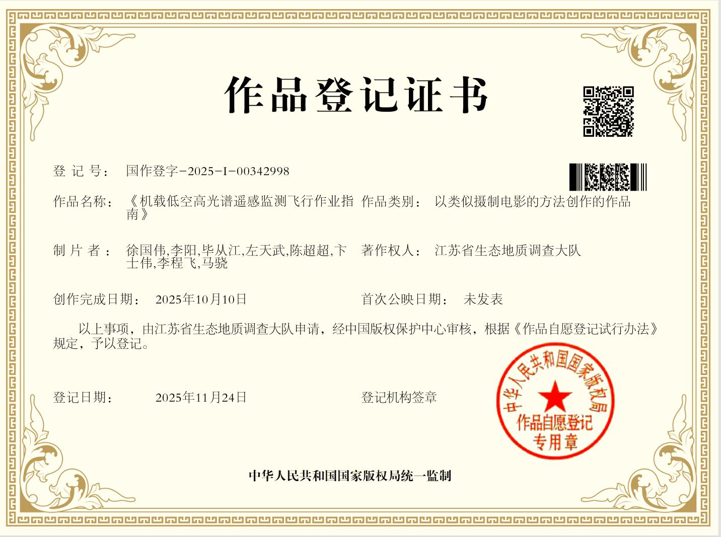 近日,由我队信息中心科普公益服务团队骨干人员与调查中心高光谱项目组通力合作完成的《机载低空高光谱遥感监测飞行作业指南》视频作品,正式获得国家版权局颁发的作品登记证书(登记号:国作登字-2025-1-00342998)。这是我队在推动项目成果规范化、版权化方面取得的一次重要进展,标志着团队视频制作与科普转化能力实现了重大突破。